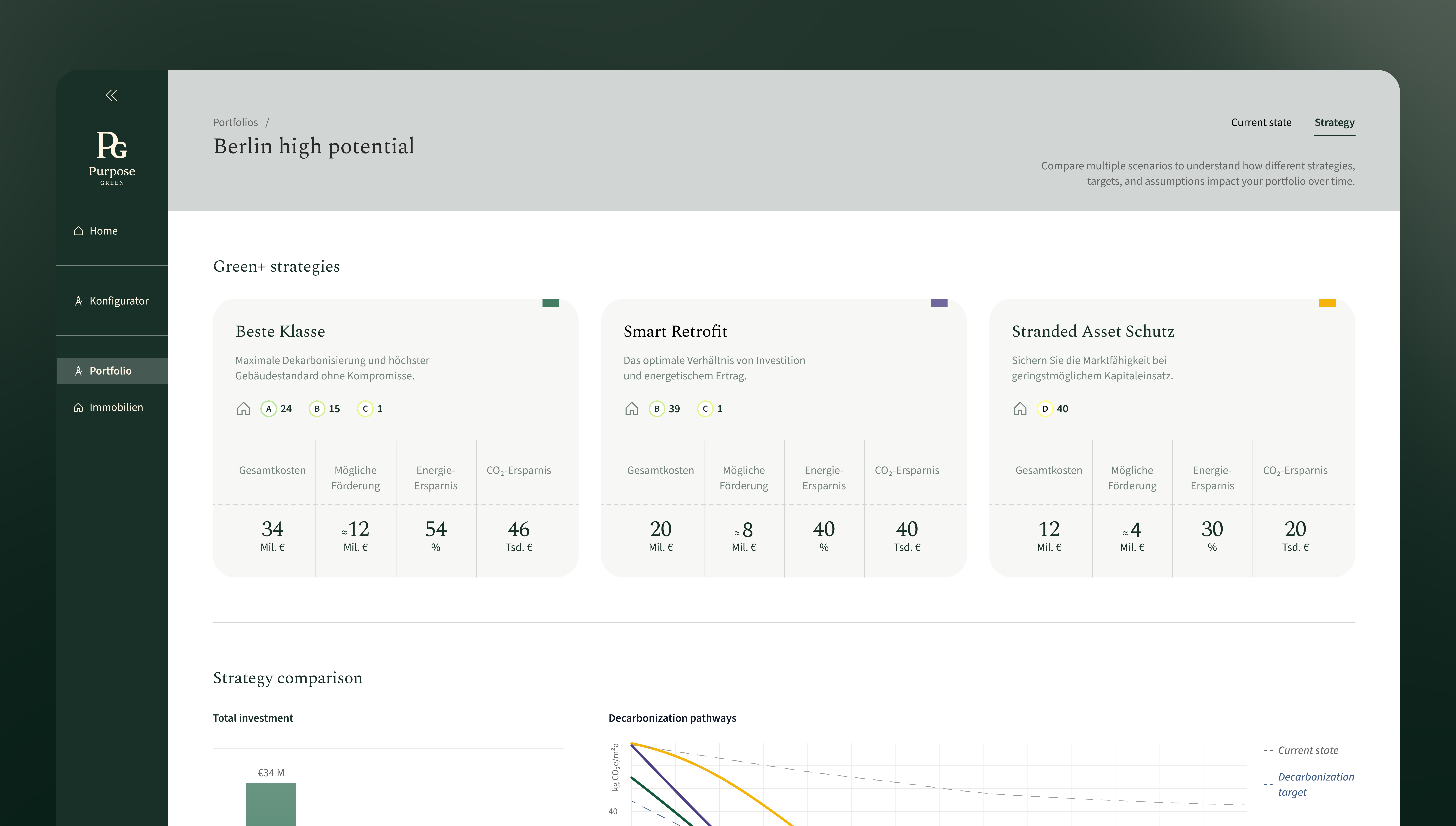 Jede Strategie zeigt Ihnen Gesamtinvestition, mögliche Förderung, Energieeinsparungen und CO₂-Ersparnis — inklusive eines direkten Vergleichs der Dekarbonisierungspfade. Öffnen Sie die Strategieübersicht in Ihrem Portfolio, um alle drei Szenarien zu erkunden.